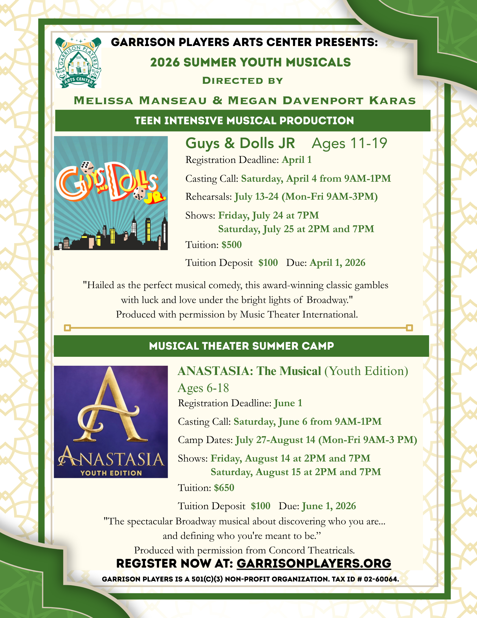 The June casting of Anastasia provides the technical crew adequate preparation time, critical for our dynamic, hands-on camp. Campers will not only be onstage, they will benefit from the strong educational component of this camp: learning about vocal health, character development, and the many offstage technical elements as well. The casting will be announced on the first day of camp: July 27. The first 40 students to register will be admitted. We typically have a waiting list for this camp in case of cancellations.